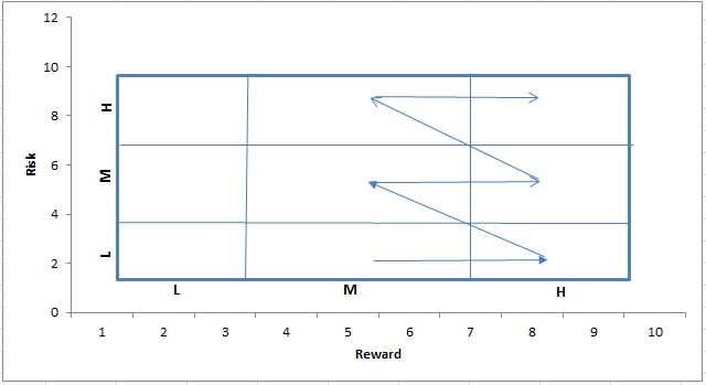 An easy tool to guide team ramp-ups by ranking initiatives. One can start with low risk and move towards higher rewards to make teams successful as they ramp-up. There are some risky paths which should be avoided , specifically in category of high risk that can put business at risk if we put complex task with new teams very early in the game. The matrix is self-explanatory and one can charter their team’s paths / road-maps by trying a couple of combinations.