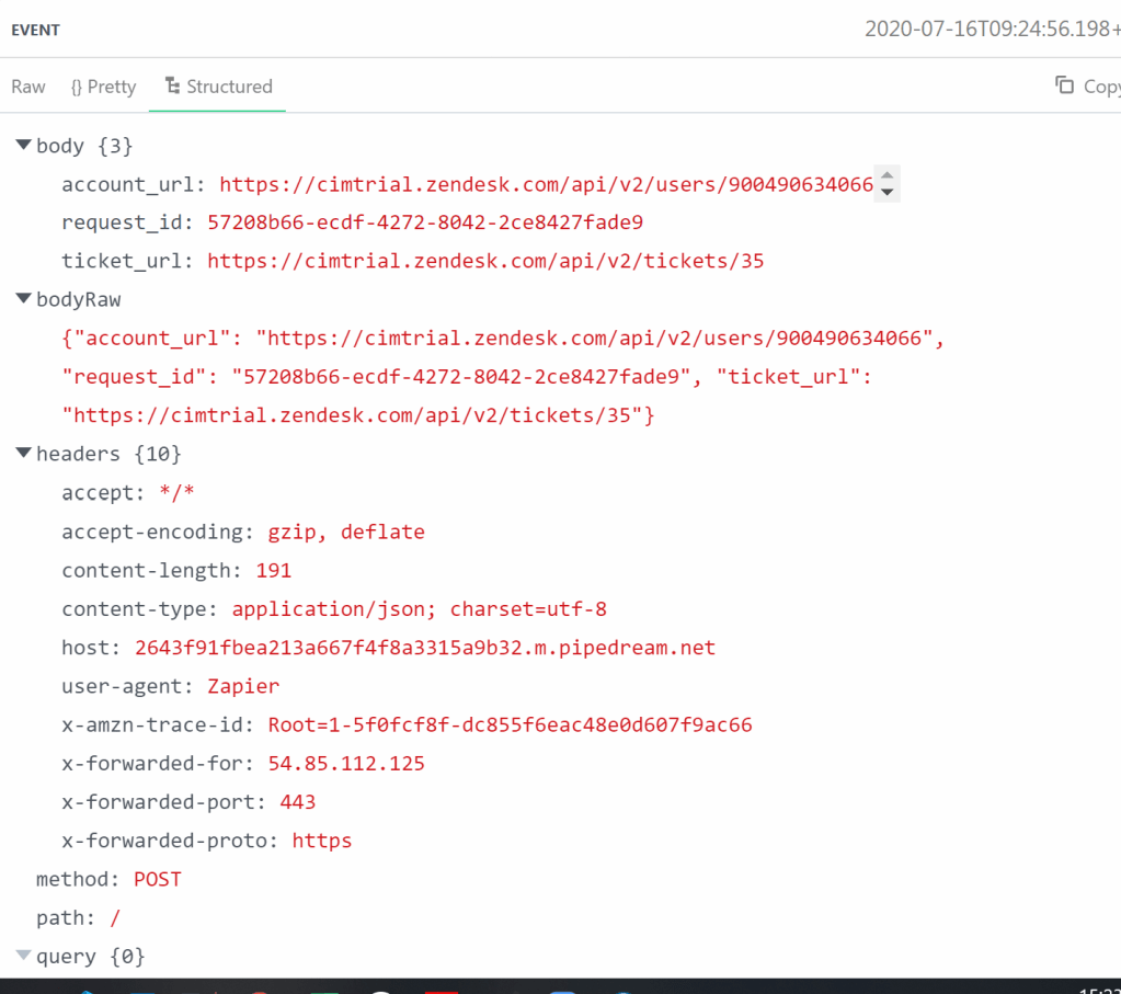 Zapier workflow construction is pretty straight forward and one can proceed very swiftly through the integration. As you can see that there is node based code to capture the response and then post back on a URL , which I grabbed from RequesBin to post the data.