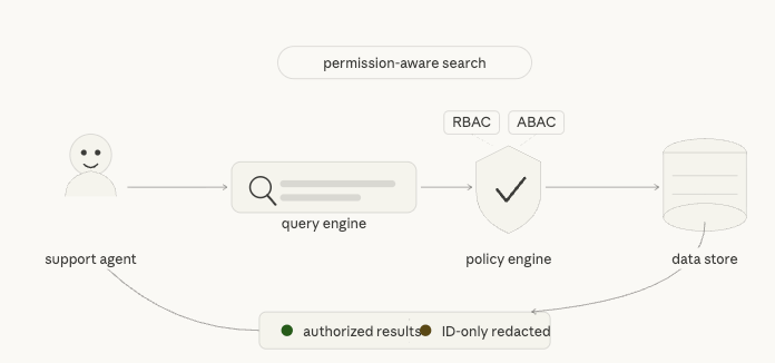 - Redaction — Authorized documents are returned in full. Unauthorized matches produce ID-only placeholders with a