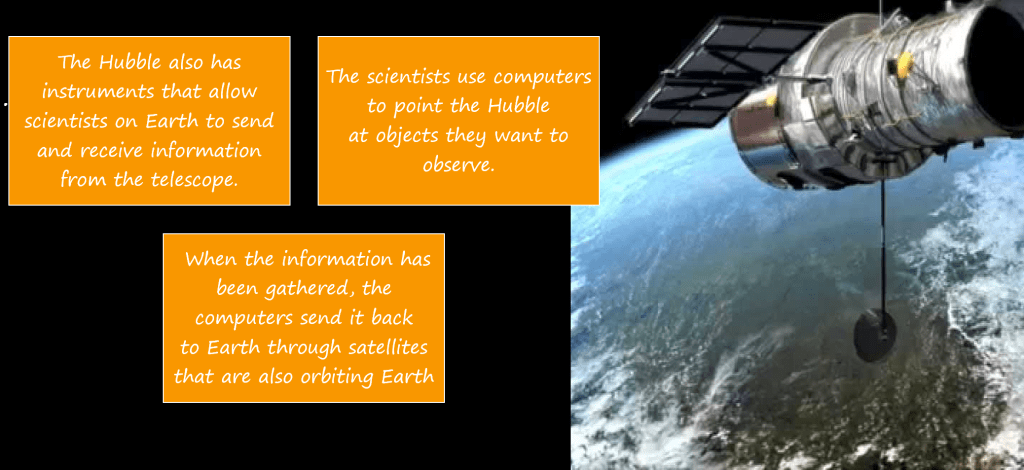 The Hubble is a large reflecting telescope. It gathers visible light and other forms of radiation from stars and other objects and directs it into several instruments. One of the instruments is a camera that can take images that are 10 times clearer than that of even the largest Earth-based telescope. Another camera can detect an object 50 times fainter than anything observable by any ground-based telescope.