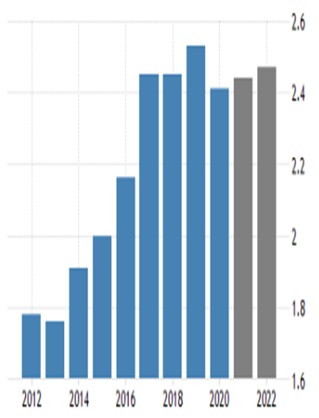 GDP in Bhutan reached to 2.20 USD Billion by the end of 2021 and it should reach up to 2.50 USD Billion by the end of 2022.