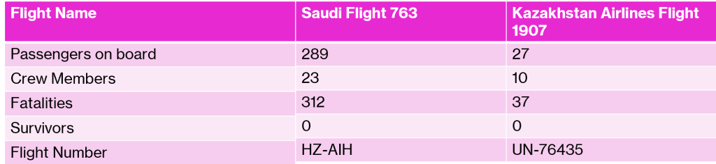 The Saudi Arabian Airlines plane crew consisted of Captain Khalid Al-Shubaily, First Officer Nazir Khan, and Flight Engineer Ahmed Edrees. The crew of Kazakhstani plane consisted of Captain Alexander Cherepanov, First Officer Ermek Dzhangirov, Flight Engineer Alexander Chuprov, Navigator Zhahanbek Aripbaev, and Radio Operator Egor Repp.